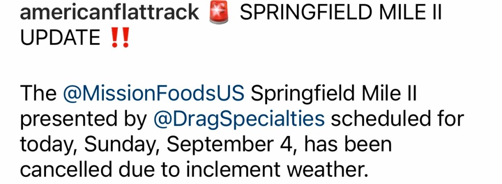 Early Sunday morning the notice was posted that the remaining Mission Springfield Mile 2022 schedule had been cancelled due to inclement weather.
