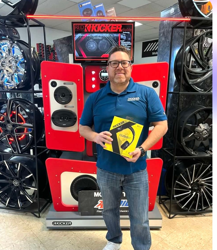 Brad holds his KICKER Headphones prize in front of a great KICKER display in his showroom.