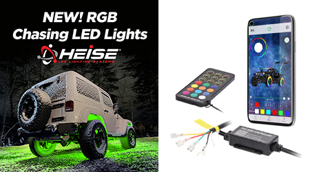HOLLY HILL, FL (03.31.22) – Heise LED Lighting Systems by Metra Electronics has added to their RGB Chasing LED product lineup. Now shipping is an RGB Chasing LED Underglow Lighting Kit with Pro Controller, 4 RGB Chasing LED Rock Light Kit with Pro Controller (12W), 8 RGB Chasing LED Rock Light Kit with Pro Controller (24W), and a Pro Controller that can now be purchased separately. These products are designed to provide dramatic, colorful lighting with minimal installation time.