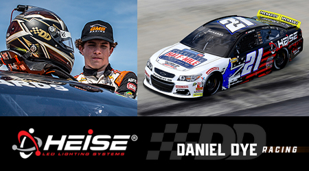 Daniel Dye’s racecars have featured Heise’s parent company, Metra Electronics, since 2018 at numerous short-track venues. This will be the first time Heise LED Lighting Systems will be featured on the quarter panels on the #21 Chevrolet SS. “We couldn’t be more thrilled to work with Daniel and have Heise front and center for this race at Bristol,” said Jake Bates of Metra Electronics. “Daniel’s Race to Stop Suicide program has been a great cause for our community and we are proud to help support his mission. This week’s race is also a great opportunity to expose viewers to Heise and the wide range of aftermarket vehicle lighting upgrades that we offer.”