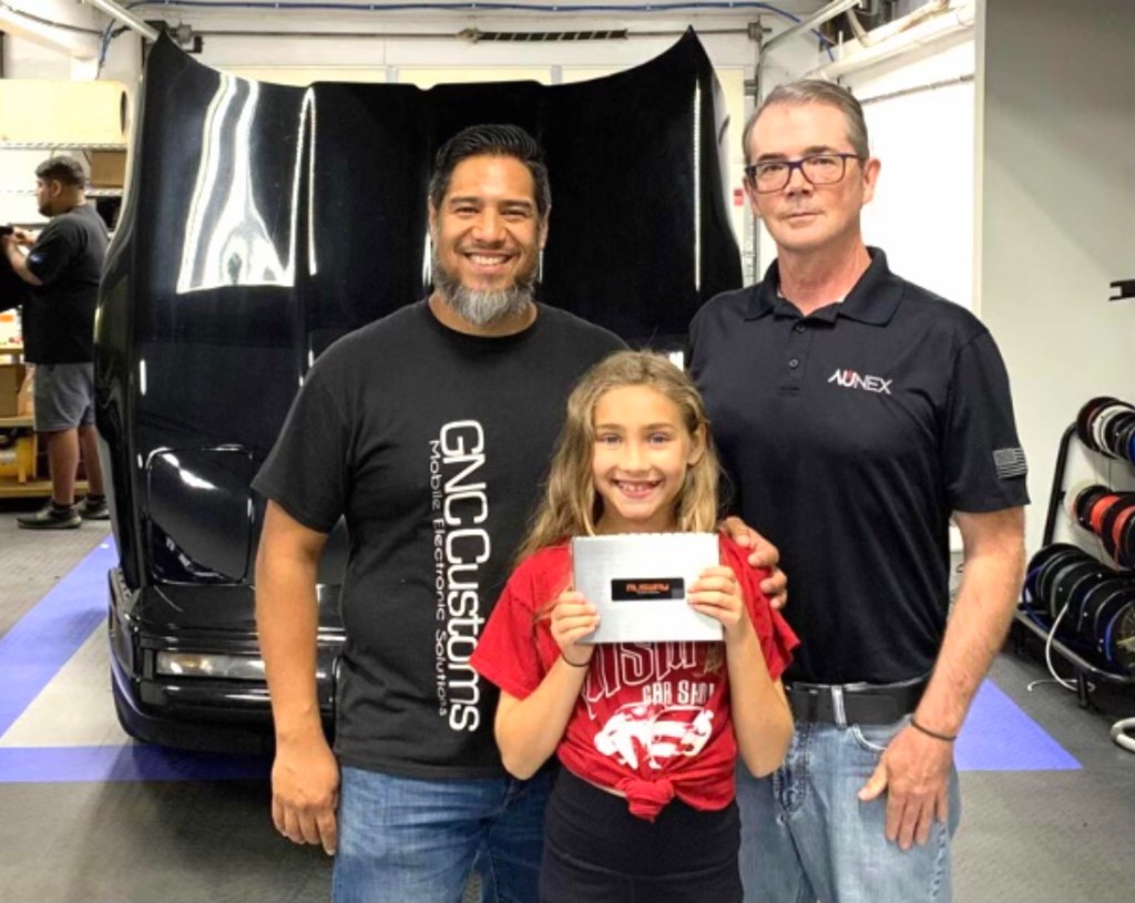 John Franks (R) is pictured with Josh Mojica and his daughter Addison, holding a Musway DSP, at GNC Customs in Goshen IN. Mojica reports the Musway DSP is selling through at retail.