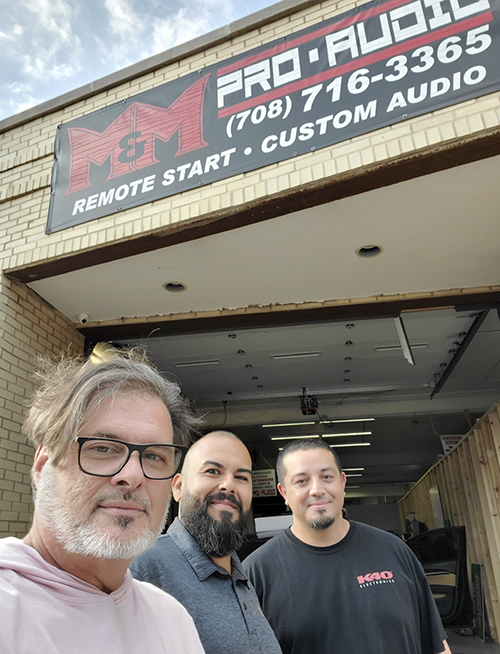 Magnadyne’s Armando Parra (L) and CE GUYS Mario Zamudio (C) are pictured with Luis Andrade during a sales call with Custom Car Audio aka M&M Pro Audio in Chicago IL. Parra, based at Magnadyne’s HQ in Compton CA, was traveling the territory with CE GUYS Team members.