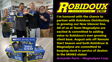 Magnadyne’s Armando Parra sounded equally excited when asked about the new partnership with Robidoux. “I’m honored to be given the opportunity to partner with Robidoux Distributing in growing our New Silencer product line. All of us at Team Magnadyne are excited and committed to adding value to Robidoux’s ever growing client base. The month of August, sets off Remote Start Season Programs, and both Robidoux and Magnadyne are committed to keeping stock in service of key retailers and expeditors in the MINKS states! Armando Parra – Magnadyne Corp.