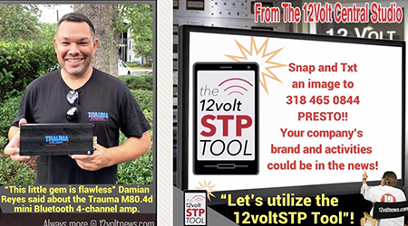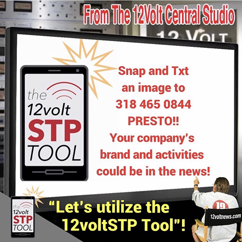 THE 12VOLT CENTRAL STUDIOS (07.08.2021) – The 12volt STP Tool provides a vehicle for members of the 12volt industry to deliver their respective brand’s news and activities to the 12volt industry. With a smartphone it’s as easy as Snapping and Txting the image to 318 465 0844. PRESTO..your company could be in the news.