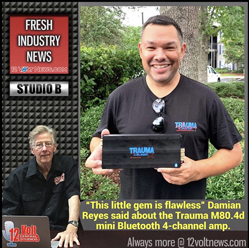 Damian Reyes held the company’s new M80.4d mini BlueTooth amplifier. He snapped and txt’ed the image. PRESTO..staff at the 12volt Central Studios made a post to Instagram and Facebook.