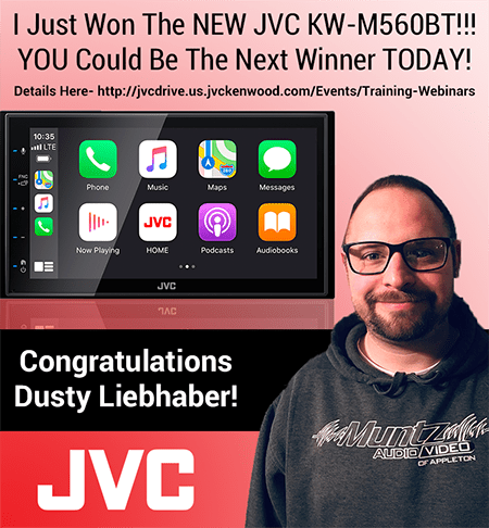 Dusty Liebhaber won a new JVC KW-M560BT during the early JVC webinar on Thursday, April 23rd. “During the webinar, I learned a lot about the in-vehicle connectivity features of the new JVC radios. When working with customers on the sales floor they will see the connectivity benefits” Liebhaber commented to 12volt News. Liebhaber is with Muntz Audio in Appleton, WI.