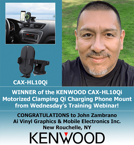 John Zambrano, Ai Vinyl Graphics and Mobile Electronics in New Rochelle NY, won the first Kenwood prize. “The Kenwood Webinar I attended on Wednesday April 15th was very informative. The presenters did a great job. It’s super to see Kenwood putting together these training webinars during this Coronavirus down time. Learning more about the DVD was super. These webinars give us a sense of community. I can’t wait to receive the Qi charger and put it in my car” Zambrano related to 12volt News.