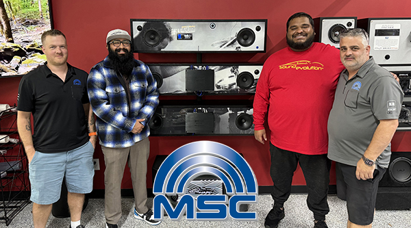 L to R: Nik Edmonds (MSC), Jake Jesty (owner / Sound Evolution), Jesh Jesty (owner / Sound Evolution), and Mike Eckley (MSC) during MSC’s recent visit to Houston to deliver and install Sound Evolution’s new product display. (image courtesy of MSC)