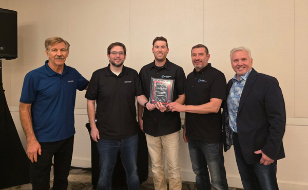 Mark Gliesner holds the Eastern Region Rep of the Year plaque flanked by Tim Hill, National Sales Manager and Kelly McDaniel Eastern Regional Sales Manager on the right.