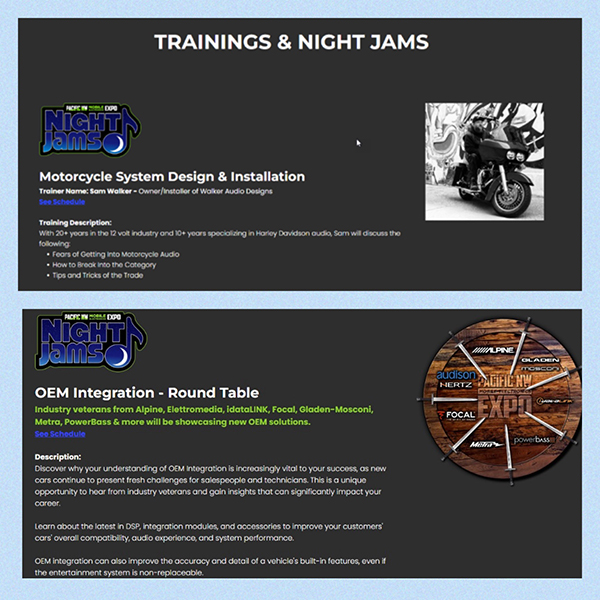 Rounding out the evening NIGHT JAMS will be an OEM Integration Round Table class at 7:30 pm by participating manufacturers. Industry veterans from Alpine, Elettromedia, iDatalink, Focal, Gladen, Mosconi, Metra, PowerBass and more will showcase new OEM Solutions.