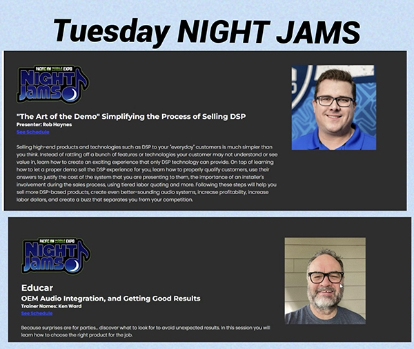 On Tuesday evening the NIGHT JAMS will kick off with a “Art of the Demo” Simplifying the Process of selling DSP by presenter Rob Haynes from JL Audio. The second NIGHT JAMS on Tuesday night will be OEM Audio Integration and Getting Good Results by Educar’s Ken Ward.