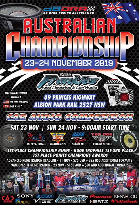 (11.12.2019) – The 2019 dB Drag Racing Australian Championship will take place 23-24 November 2019 in Albion Park Rail, NSW. Competitors from all around Australia will compete in this invitational event hosted by Frankie’s Auto Electrics and Car Audio. There is an opportunity to compete in 4 different formats of competition including: dB Drag Racing, Bass Race, Psychlone and Top Dog for a total of 19 classes available. Trophies will be awarded to the 1st – 3rd place winners in each class, along with Championship Rings for 1st place winners.