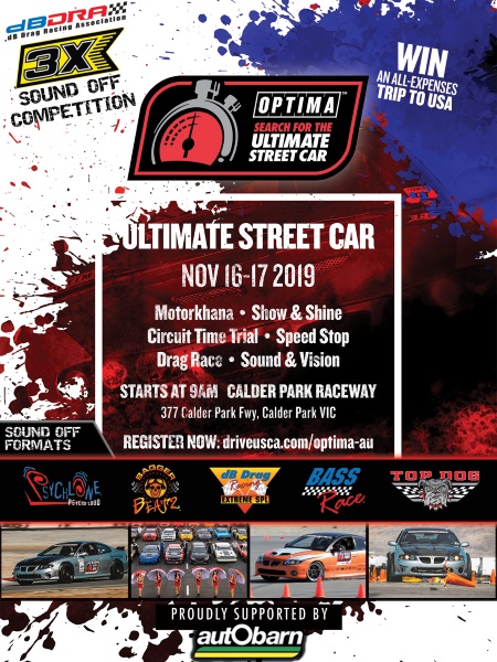 SOUTHFIELD, MI (11.22.2019) – OPTIMA’s Search for the Ultimate Street Car took place at Calder Park Raceway in Melbourne Australia during the weekend of November 16-17, 2019. The event was a multi-segment competition and car show event and dB Drag Racing was the official Sound and Vision partner. Competitors had a chance to compete in 2 events over the course of the 2-day show with this being the last 2 events leading up to the Australian Championship taking place the following weekend just outside of Sydney.
