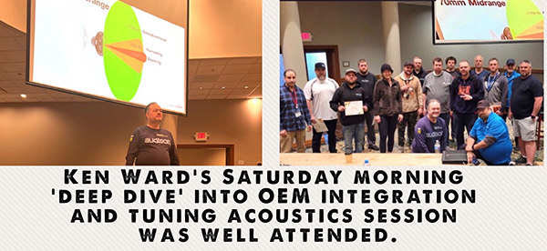 Ken Ward conducted live acoustic tuning demos outside on Friday. Saturday morning he conducted a session that took a ‘deep dive’ into OEM integration and tuning acoustics session that lasted 4 hours. Saturday rain and cold limited everything to the indoor classroom.