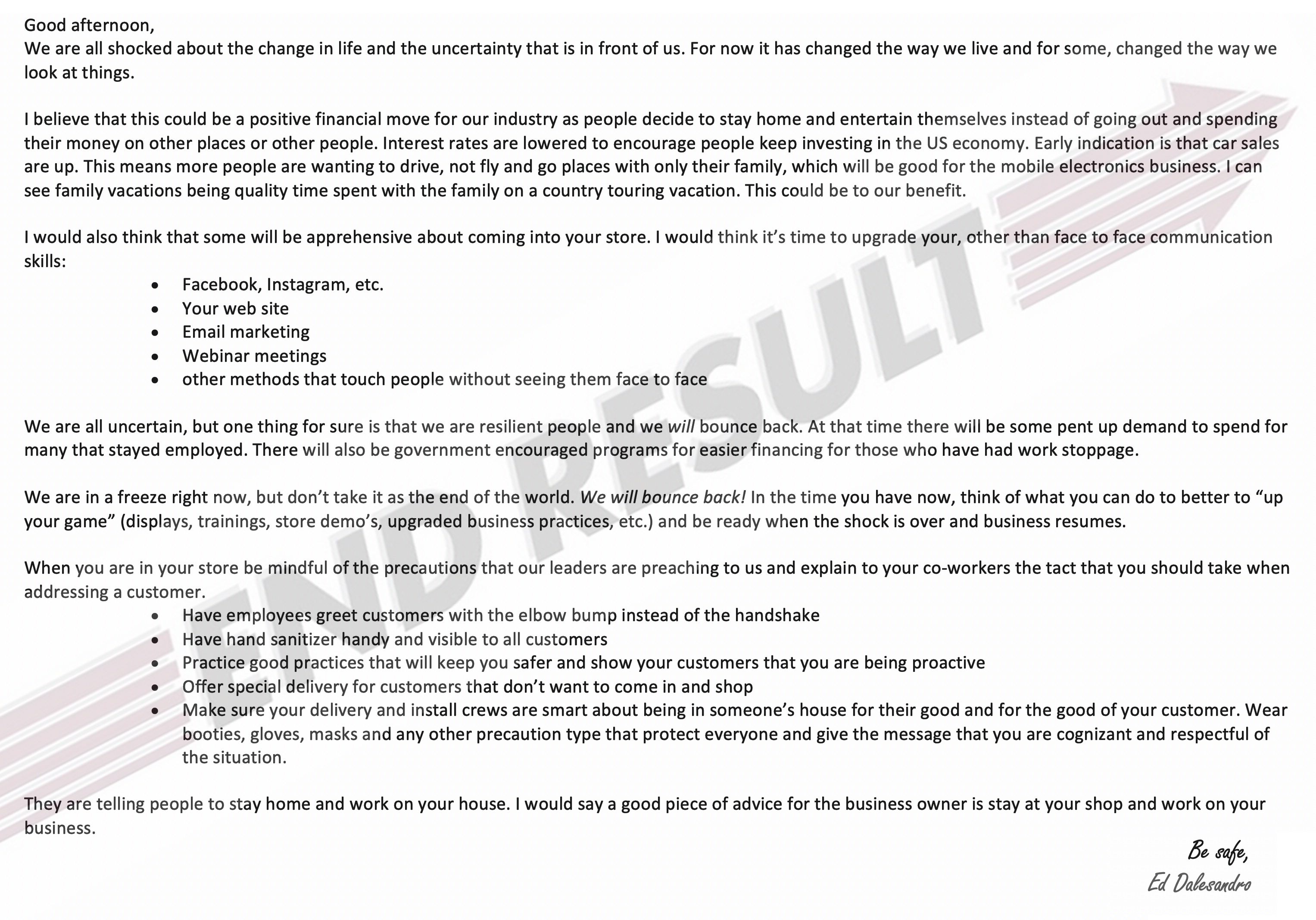 CANONSBURG, PA (03.20.2020) – Ed Dalesandro and the End Result Rep Firm reached out to dealer partners with business strategy suggestion emails on Monday March 16th and Tuesday March 17th. Dalesandro’s emails focused on business suggestions as the Coronavirus grips the world and the 12volt industry. End Result is an award winning rep firm based in Canonsburg PA that has been serving 12volt and Home AV retailers and distributors in Ohio, West Virginia along with Western Pennsylvania for 3 decades.