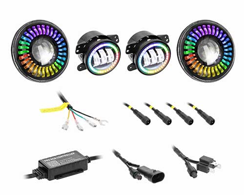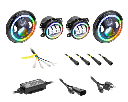The JP-707RGBKT and JP-708RGBKT include everything an installer needs to upgrade to chasing halo RGB LED headlights and fog lights. Each package includes a pair of 7″ chasing RGB LED headlights, a pair of 4″ chasing LED fog lights, and a Pro Controller. There are two different types of headlights offered in these new kits to fit the luminosity and style preferences of the consumer. Durable polycarbonate lens covers make these lights an ideal solution for adventurous Jeep owners. Additionally, these lighting sets work with other Heise Chasing RGB lighting products, allowing an entire system to use the same app and remote.