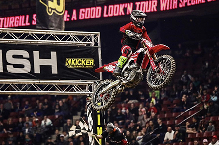 Kyle Peters, 2020 AMA Arenacross Pro National Champion, flying high at the Kicker Arenacross in the Maverick Center in SLC.