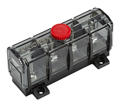 KICKER’s MRBF fuses also meet SAE-J1171 standards for ignition protection and are IP66 rated. Sizes ranging from 40 to 300 amps are available.