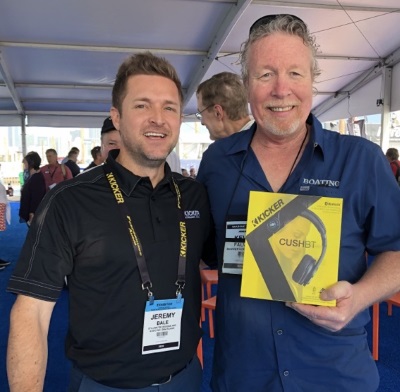 Kevin Falvey (R), Editor of Boating Magazine won Kicker CushBT headphones presented by Jeremy Bale.