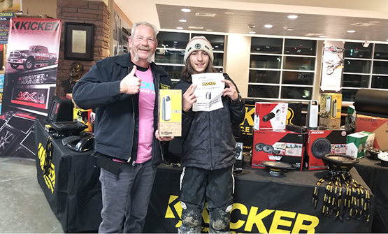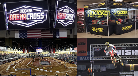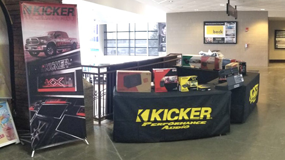 Continuing, “We had a display area in the lobby area and virtually everyone who entered the Lazy E Arena had to pass by the KICKER setup. We had a selection of KICKER products for all to see. We were talking to members of the crowd about KICKER throughout the evening. Oklahoma is truck country so the new KICKER L7T under seat drew a lot of attention. Powersports in strong in the area too so the KICKER RZR grabbed attention. The PowerBar really opened eyes when we cranked it on the RZR in the lobby.”