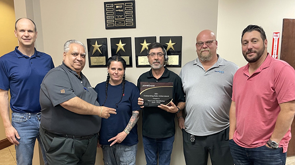 Nelson Pierantoni (2nd L) presented the PowerBass Outstanding Sales Achievement 2021 Award to the Next Level Distribution team at their facility in Juniper FL. (L to R) Dan McClimans, Pierantoni-TriStar Marketing, Doreen McQuade, Bryan Mongiovi, Jeff Allen and Shane Mullikin.