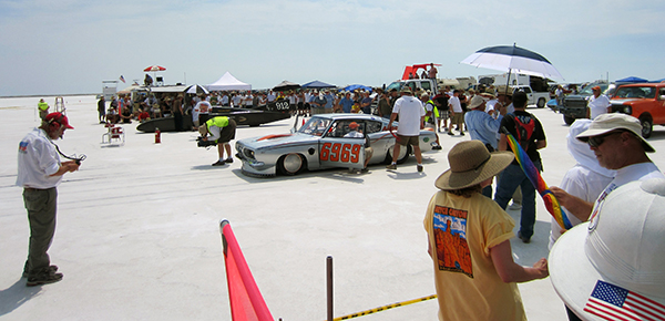 Located in northwestern Utah, the Bonneville Salt Flats are composed of densely packed salt remnants of an ancient lakebed formed over thousands of years. They serve as a unique stage set for movies, commercials, marathons, and rocket club launches, and possess rare physical qualities that make it the perfect venue for land speed racing, such as providing a cool surface that doesn’t overheat tires. Since 1914, hundreds of land speed records have been set and broken in a variety of automotive and motorcycle classes. Speed Week, the marquee event at Bonneville, began in 1949, with scores of racers and thousands of spectators descending on Bonneville in the quest for records.