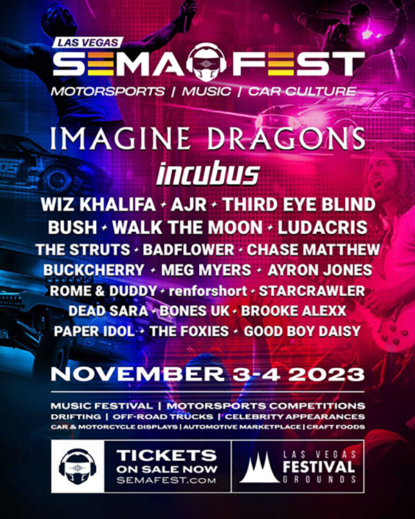 DIAMOND BAR, CA (07.19.23) – Tickets for the inaugural SEMA Fest, a two-day full-throttle festival that fuses car culture and music, are on sale now at semafest.com. Set for November 3-4 at the Las Vegas Festival Grounds in Las Vegas, SEMA Fest is a must-attend event open to the public and featuring world-class musical acts Imagine Dragons, Incubus, Wiz Khalifa, AJR, Third Eye Blind, Bush, Walk The Moon, Ludacris and more (the complete lineup is below, with more to come).