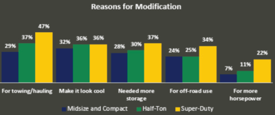 “Nearly all trucks are used as daily drivers, and most people consider their pickup a utility vehicle,” said Knapp. “But a large percentage also utilize their pickups for travel, which can mean pulling a trailer, adding a camper, or equipping it with gear to get off road. It’s when we get into some of those specifics that we really see the opportunities for our industry. If you look at the people who think of their truck as an outdoor recreation vehicle, as a work vehicle, or as an off-road vehicle, their specialized needs become the driving forces for all of their accessory and modification decisions.”