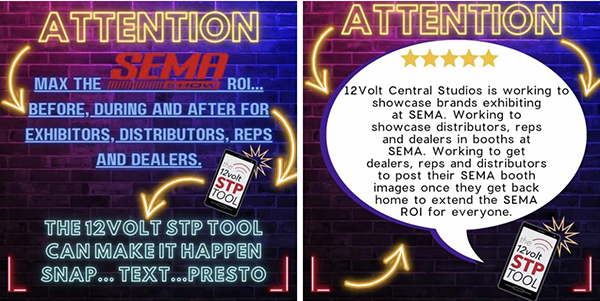 The 12volt Central Studios is working to showcase brands exhibiting at the 2023 SEMA Show. The 12volt Central Studios will also be working to showcase reps, distributors and dealers in booths at the 2023 SEMA Show. The 12volt Central will continue working to showcase reps, distributors and dealers activities at the 2023 SEMA Show once they return to theirs offices and stores to continue the ROI from attending the event. Reps, distributors and dealers can continue their SEMA Show ROI by utilizing their booth images from the event through their social media and digital outreach. All of this can happen when attendees utilize the 12voltSTP Tool.