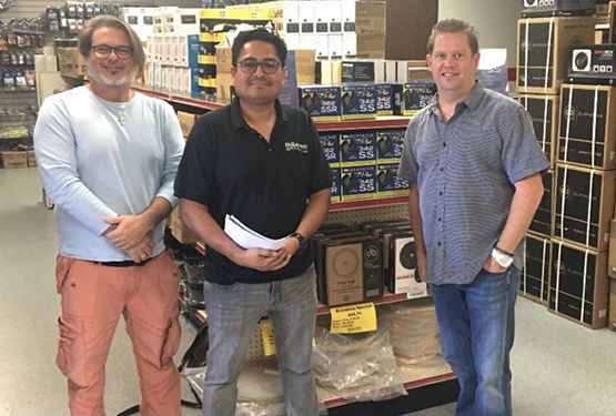 Broadway Distributor, based in Houston, it’s now stocking Silencer Remote Starter and Security products. Andy Pariona, Branch Manager, is flanked by Magnadyne’s Armando Parra and Synergy Marketing’s David Toliver (R).